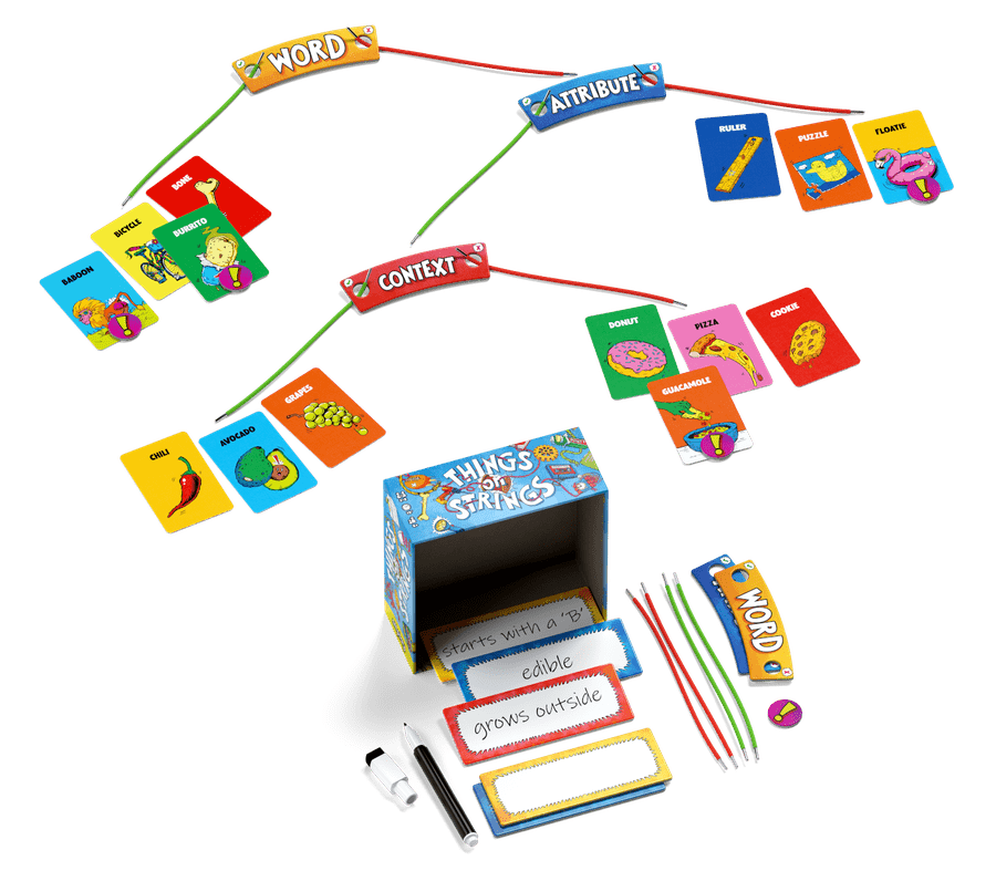 Things on Strings also features 200 new and unique Thing cards, completely compatible with other Things games and expansions. When developing this word list, we had to consider the various Rules cards that existed in Things in Rings, while also considering their utility in this new game. Internally we track the total percentage of Things that each Rule from previous SKUs is relevant to, eg "has two vowels", "contains liquid", etc, and made sure a plurality of new cards interacted with those.