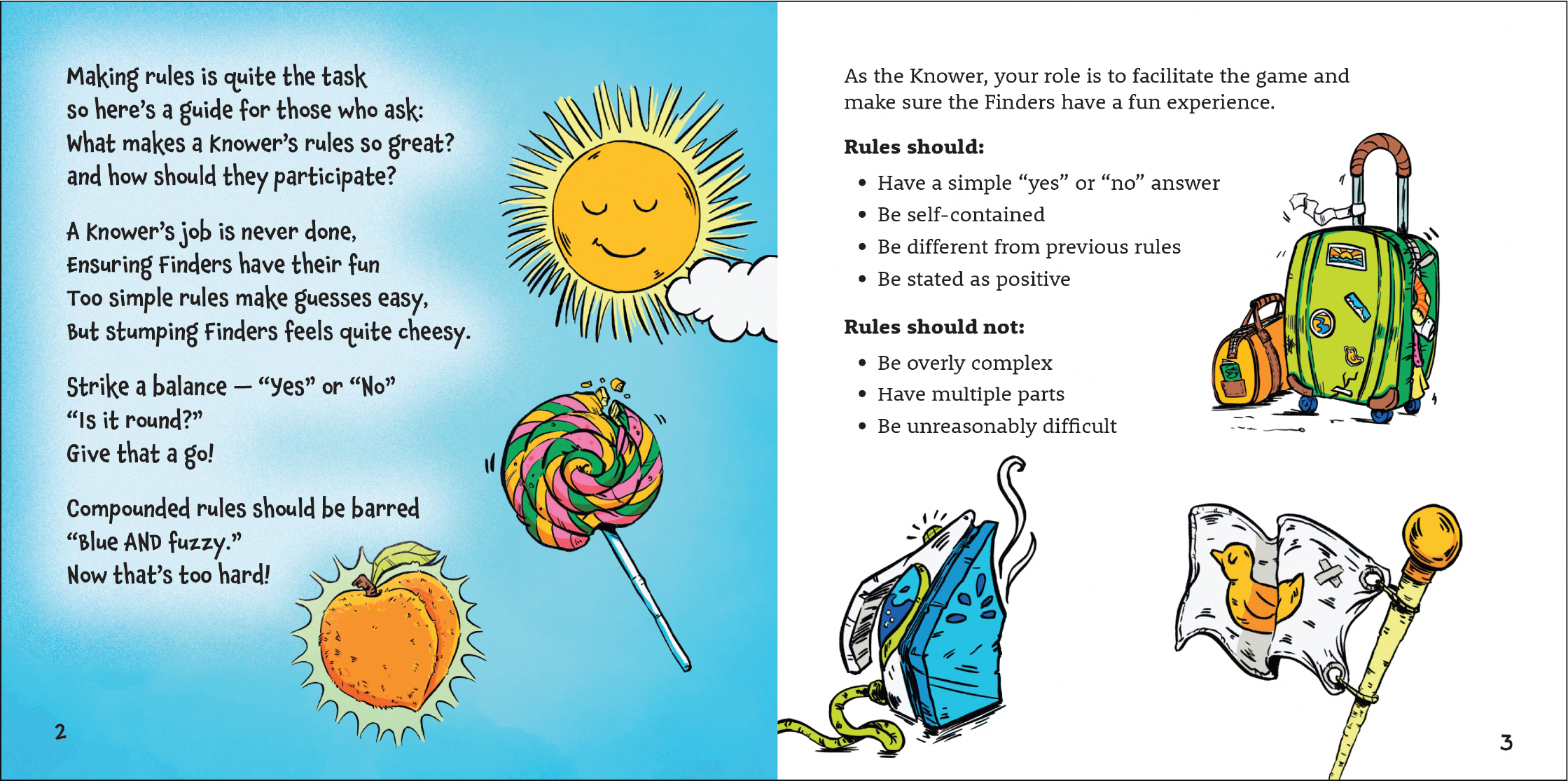 So we developed The Knower Knows guide. This guide takes the form of a small Suess-inspired rulebook, just for the Finder. Through rhyming poems, a continuing motif in these games, it teaches the Knower player proper rulemaking, with examples, and serves as reference material for them through the game.