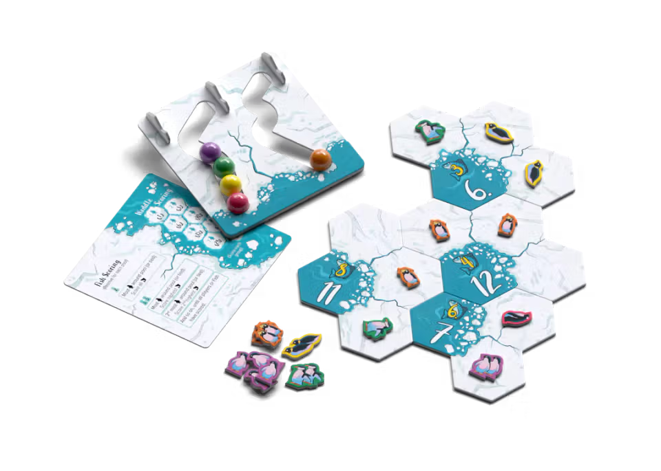 Another significant change was fish scoring. In both versions of the game, players scored fish based on having a majority of penguins around a pool. The original had fish scoring rules that varied at multiple player counts, and was often confusing to players. The updated Waddle captures the essence of fish scoring in a clearer way, while greatly increasing points per fish and number of fish on the map, making fish scoring much more engaging overall.